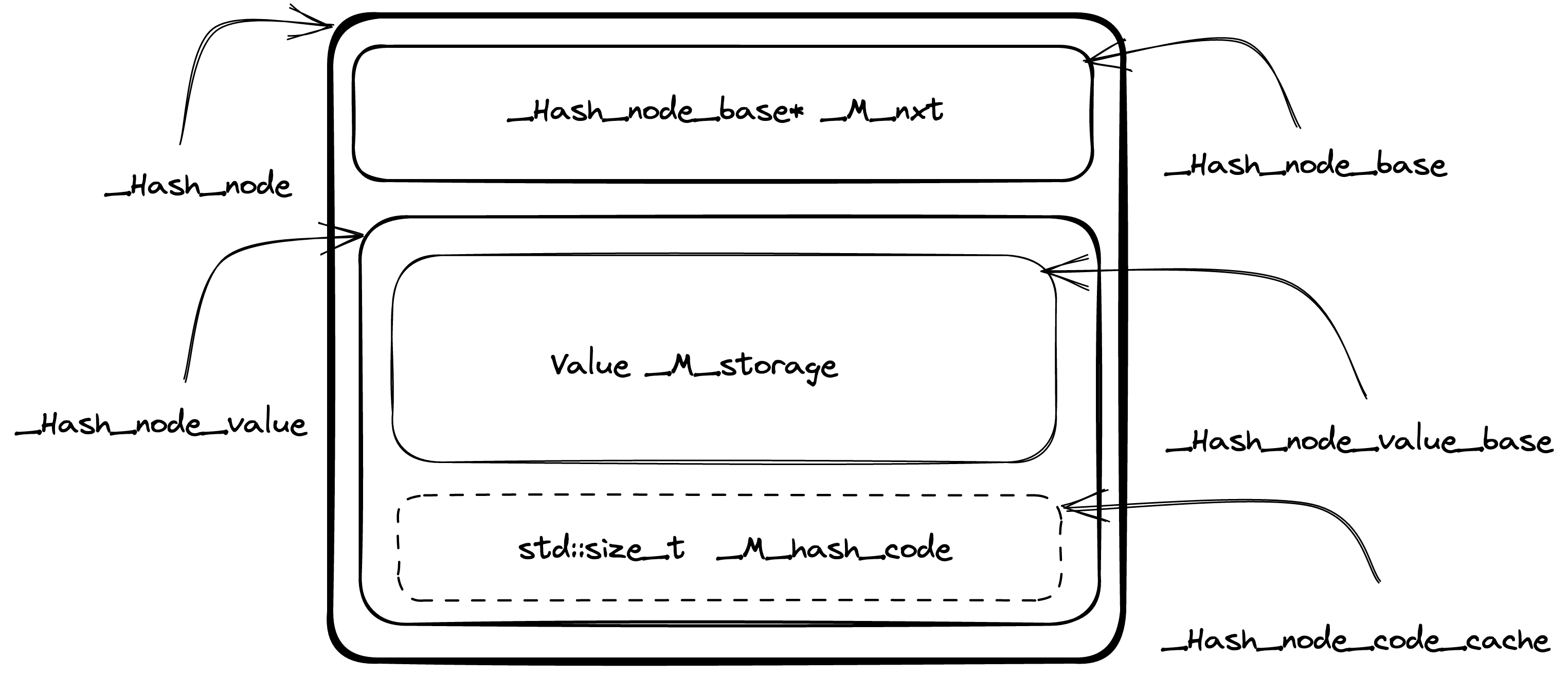 _Hash_node_base* _M_nxtis a pointer to the next element in the linked list of hash table elements.__gnu_cxx::__aligned_buffer<_Value> _M_storage— node data itself. For example forstd::unordered_map<std::string, int>container_Valuetemplate argument isstd::pair<const std::string, int>.std::size_t _M_hash_codeoptional cached value of key's hash.