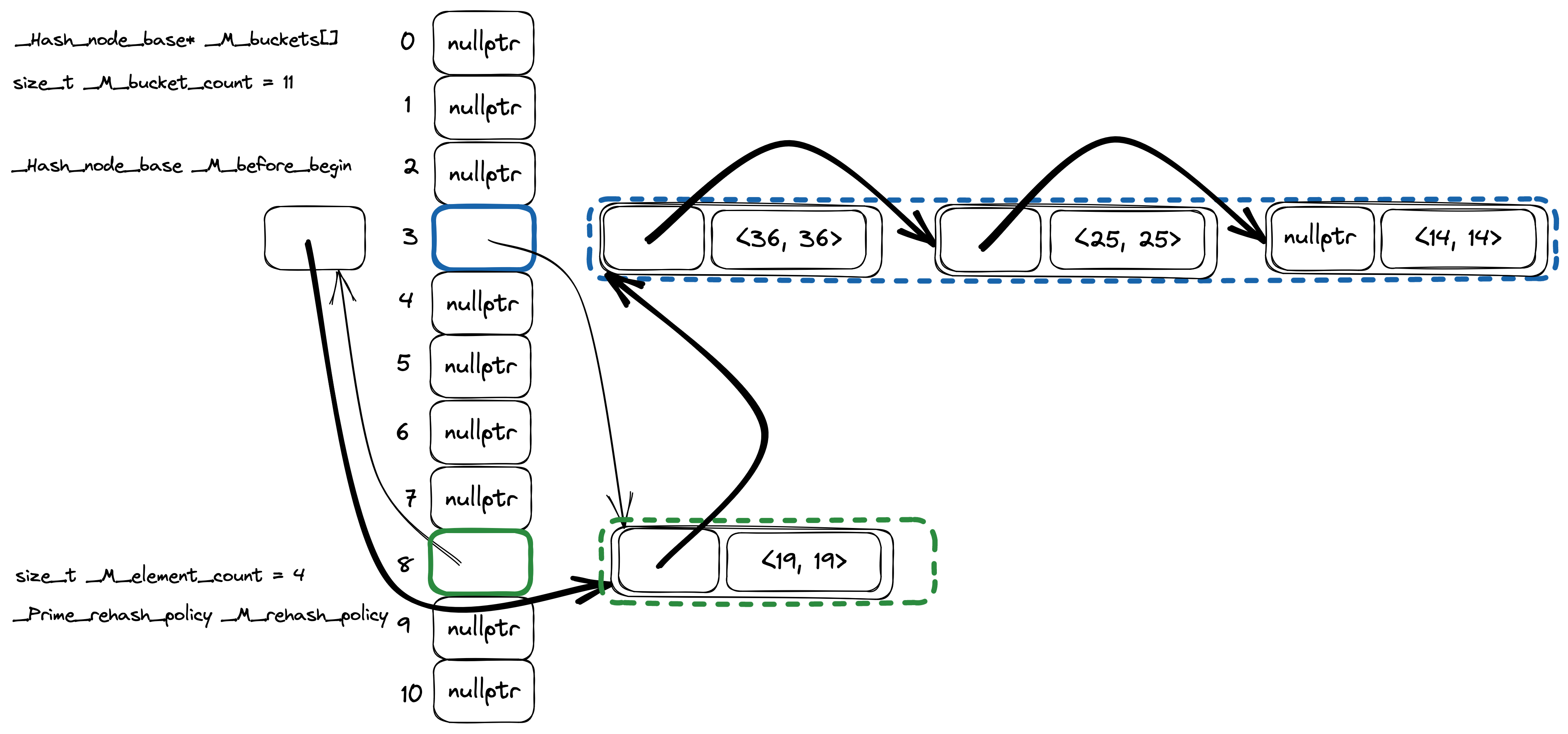 from the hashtable.h header to grasp the basics of _Hashtable data layout.